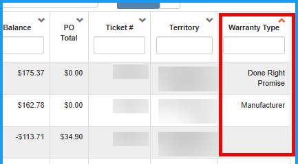 - Warranty was changed from a check box to the Warranty Type selected on the work order