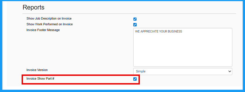 - if checked, the invoice report will show the Part # column, as it always did. If unchecked, it will hide that column. NOTE: The default value is checked so the report will look the same as it always did.